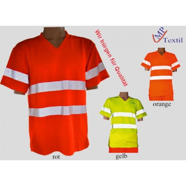 Spetz. T-Shirt Material: 55% Baumwolle u. 45% Polyester Innenseite 100% Baumwolle für einen angenehmeren Tragekomfort, Außenseite 100% Polyester fluoreszierend, T- Shirt mit Grosszügigem V-Ausschnitt, 3M Reflexband Unterbrochen. lieferbare Farben: orange, gelb und rot fluoreszierend, lieferbare Grössen XS, S, M, L, XL, XXL, 3XL, 4XL, 5XL, Übergrössenzuschlag für 4XL u. 5XL Fr. 7.--