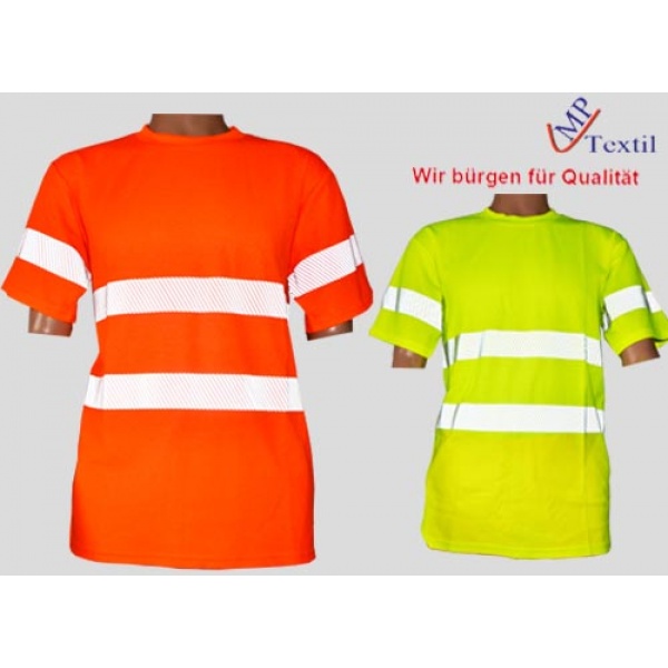 Spetz. T-Shirt Material: 55% Baumwolle u. 45% Polyester Innenseite 100% Baumwolle für einen angenehmeren Tragekomfort, Außenseite 100% Polyester mit dem fluoreszierender Effekt, Ausstattung: T- Shirt mit Rund Halsausschnitt, 3M Reflexstreifen Unterbrochen. Grössen XS, S, M, L, XL, XXL, 3XL, 4XL, 5XL,