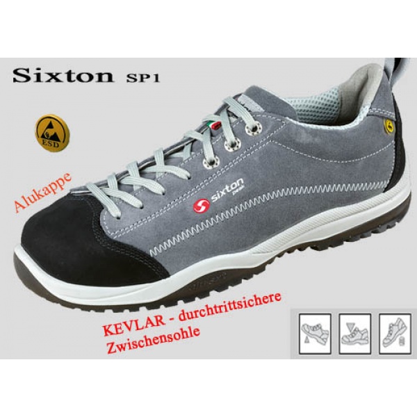 ESD-Sicherheitshalbschuh SIXTON mit textiler Zwischensohle. Schaft: Graues, ungelochtes Nubukleder, Textilfutter, gepolsterter Schaftrand, gepolsterte Staublasche, nicht magnetische Zehenschutz-Alukappe. Fussbett: Textile Brandsohle, Einlegesohle. Sohle: Textile Zwischensohle, trittweiche Duo-PU-Sohle, ESD-geprüft, öl-, benzin- und säurefest, antistatisch, hitzebeständig bis 120°C. lieferbare Grössen 36 - 48 weite 11