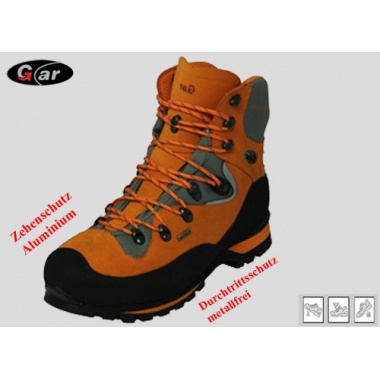 Obermaterial: Wildleder mit Nylon-Einsätzen kombiniert Futter: Atmungsaktive Membrane, wasserdicht Sohle: Vibramlaufsohle mit 2 Zwischensohlen Zehenschutz: Aluminium Durchtrittschutz: metallfrei (Composite) Extras: Sehr leichter Sicherheits-Gebirgsschuh, extrem robust, mit reflektierenden Einsätzen im Schaftbereich, lieferbare Grössen: 37 - 48