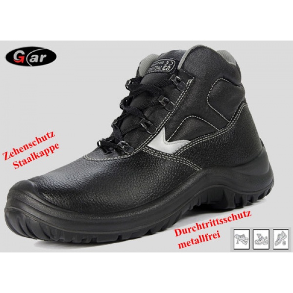 Sohle: PU, rutschhemmend, öl- und benzinbeständig, Obermaterial: Leder, Futter: Textilfutter, Zehenschutz: Stahlkappe, lieferbare Grössen: 36 - 48