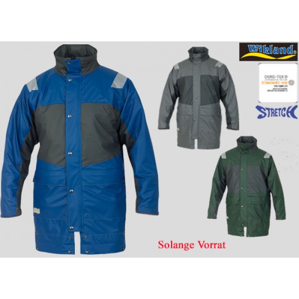 Material: 100 % Polyester, 170 g/m2, PU Aussenbeschichtung, Wasserdichtheitsklasse 3 (EN 343), Wasserdampf-Durchgangswiderstand Kl. 1, Hochkragen mit integrierter Kapuze, Doppelte Frontleiste mit abgedecktem Reissverschluss und Druckknöpfen, Verstellbare Ärmelabschlüsse mit Druckknopf, Regenrinne mit Druckknopf unten, lieferbare Farben: blau/anthrazit, lieferbare Grössen: XS - 3XL
