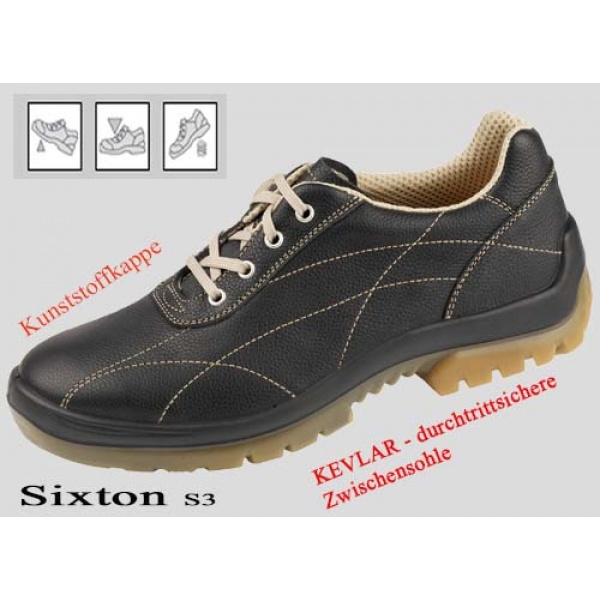 Sicherheitshalbschuh SIXTON, Schwarzes Rindsleder, Textilfutter, gepolsterter Schaftrand, gepolsterte Staublasche, Zehenschutz-Kunststoffkappe, Nageldurchtrittsichere KEVLAR-Zwischensohle. Texonbrandsohle, antibakterielle Einlegesohle, Trittweiche Duo-PU-Sohle, Schockabsorber im Fersenbereich, öl-, benzin- und säurefest, antistatisch, hitzebeständig bis 120 °C, Lieferbare Grössen: 36, 37, 38, 39, 40, 41, 42, 43, 44, 45, 46, 47, Weite 11.