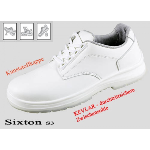 Metallfreier Sicherheitshalbschuh SIXTON mit textiler Zwischensohle. Schaft: Weisses, atmungsaktives, wasserabstossendes Mikrofasermaterial, antibakterielles Textilfutter, gepolsterter Schaftrand und Staublasche, Temperatur ausgleichende, korrosionsfreie und nicht magnetische Zehenschutz-Kunststoffkappe. Fussbett: Texonbrandsohle, antibakterielle Einlegesohle. Sohle: Textile Zwischensohle, trittweiche Duo-PU-Sohle, öl-, benzin- und säurefest, antistatisch, hitzebeständig bis 120 °C. lieferbare Grössen 36, 37, 38, 39, 40, 41, 42, 43, 44, 45, 46, 47, Weite 11.